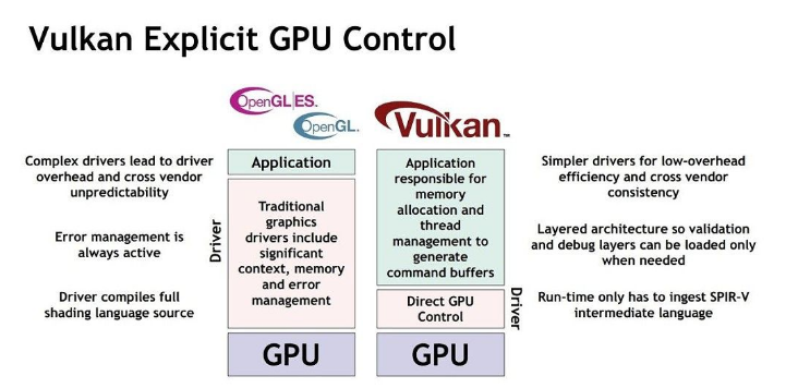 앞서 말한 Open GL의 한계점을 해결하기 위해 개발된 그래픽스 API입니다. Vulkan과 Open GL의 가장 큰 차이점은 Vulkan은 저수준의 API이고, Open GL은 고수준의 API라는 것입니다. 간단히 말하면, Open GL은 개발자가 사용하기 쉽고 해야하는 많은 일들이 드라이버에서 이뤄지는 반면에, Vulkan은 개발자가 커널 수준의 작업까지 직접해야 하기 때문에 Open GL과 달리 어플리케이션이 죽거나 심지어 커널 패닉까지 발생할 수 있습니다.