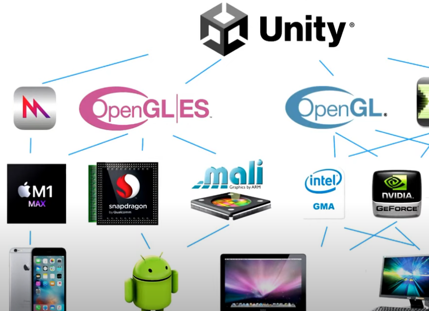 유니티가 안드로이드, IOS, PC 등의 다양한 플랫폼을 지원할 수 있는 이유는, 중간 과정에서 각 플랫폼에 따라 적합한 그래픽스 API를 지원하고 있기 때문입니다.